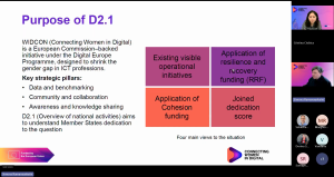 During the “Understanding national actions on women in digital cross Europe” webinar, organised by Connecting Women in Digital, Simona Ramanauskaitė from the Vilnius Gediminas Technical University, and our consultant Cristina Ciobica, explored the latest findings from WIDCON’s national actions analysis and its complementary assessment tool, the Women in Digital (WiD) Index. Together, these resources paint the clearest picture yet of how Europe is tackling the digital gender gap.