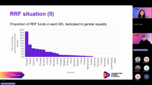 The RRF analysis measured the proportion of granted funds contributing to gender equality. Sweden (nearly 19%) and Ireland (approx. 9%) allocate the highest percentage of their RRF funding toward gender equality. However, several countries including Lithuania, Romania, Croatia, and Denmark register 0% dedicated funding in this context.
